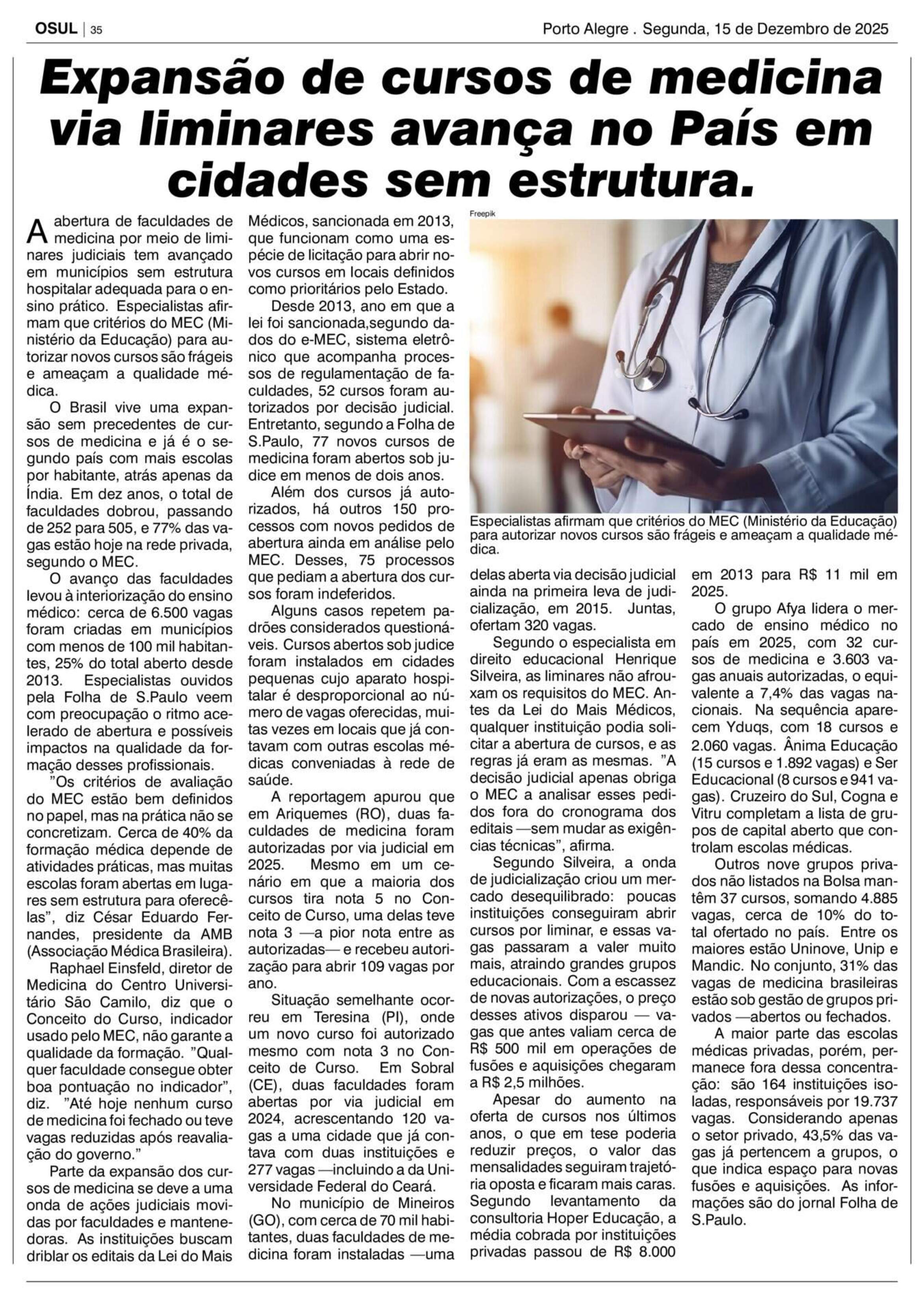 Impresso: Expansão de cursos de medicina via liminares avança no País em cidades sem estrutura