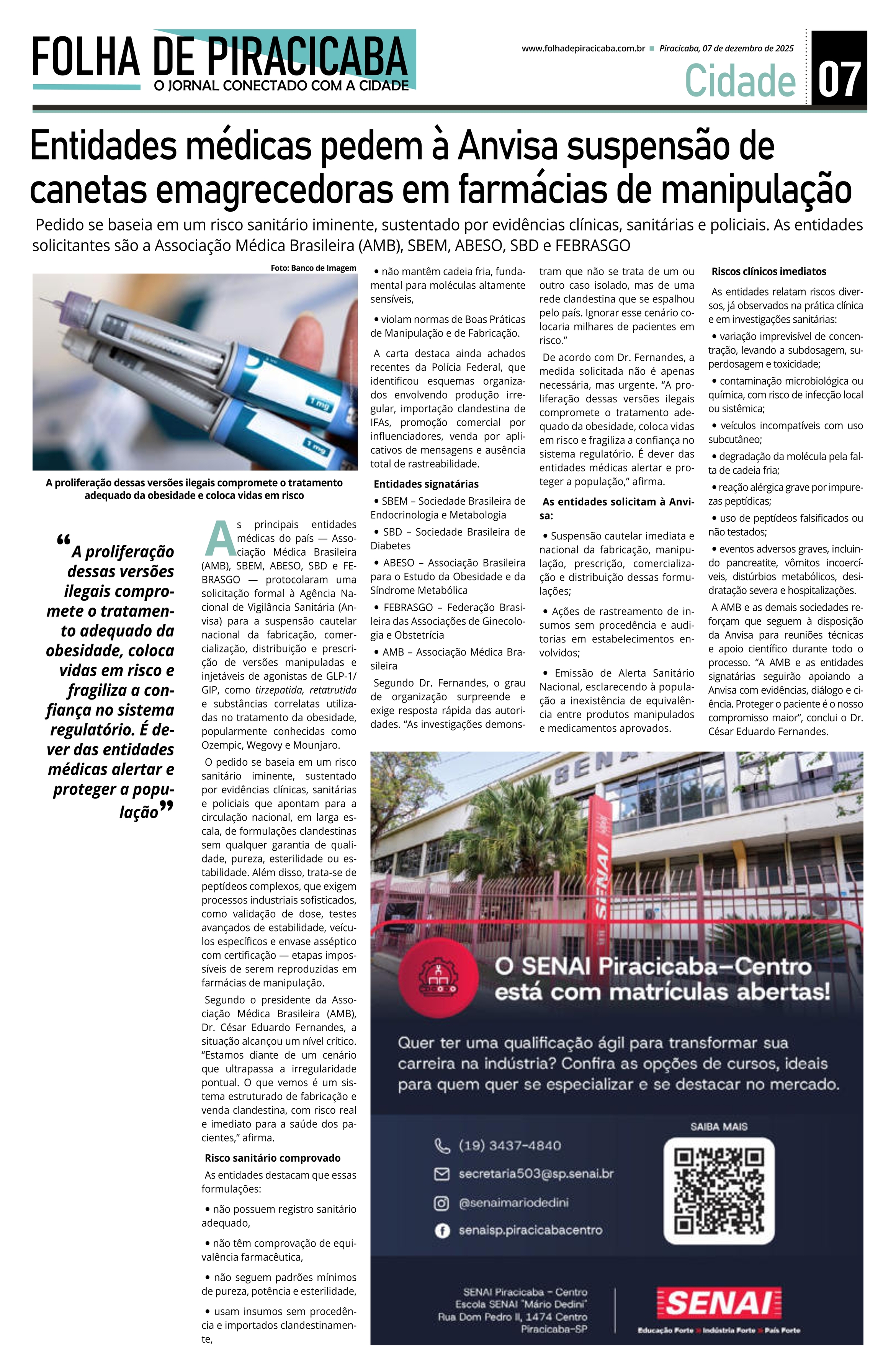 Impresso: Entidades médicas pedem suspensão de canetas emagrecedoras em farmácias de manipulação