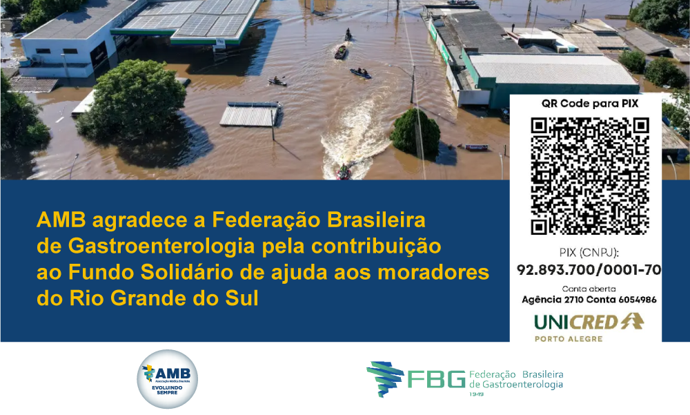 AMB agradece à Federação Brasileira de Gastroenterologia pela contribuição ao Fundo Solidário de ajuda aos moradores do Rio Grande do Sul 20 de maio de 2024 Leia Mais »
