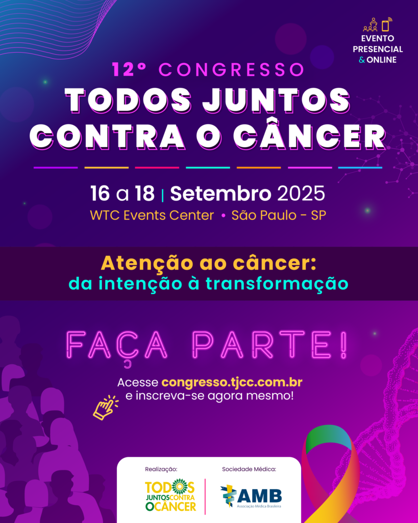 16 a 18/09 – 12º Congresso Todos Juntos Contra o Câncer Associados AMB possuem 30% de desconto exclusivo na inscrição com o cupom 12TJCCAMB Detalhes do Evento Tipo: Presencial Data: 18/09/25 a 18/08/25 Inscrição