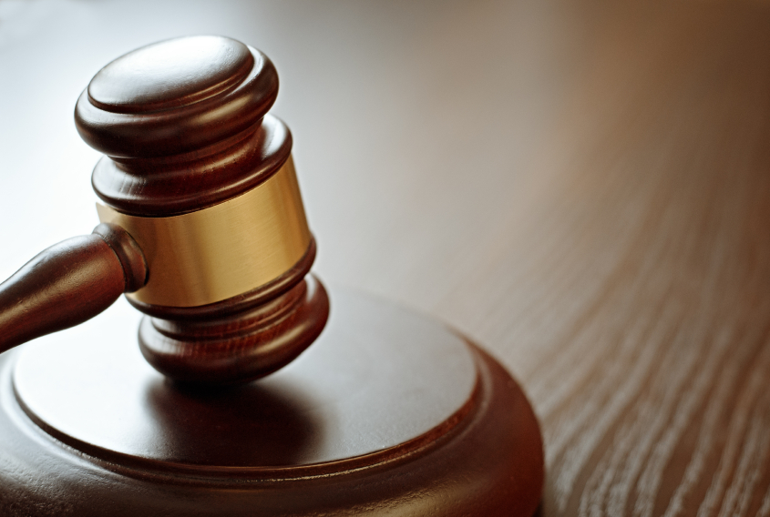 Gavel with sounding block on wooden surface