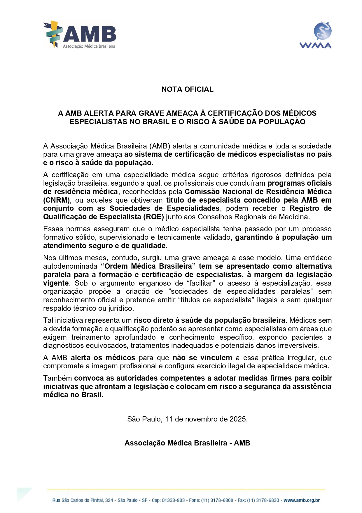 AMB alerta para grave ameaça à certificação dos médicos especialistas no Brasil e o risco à saúde da população 12 de novembro de 2025 - Categoria: Notícias