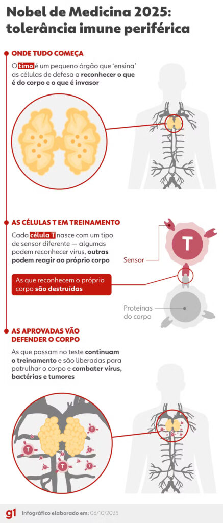 A pesquisa dos laureados revelou como o sistema imunológico é mantido sob controle — e por que ele não destrói o próprio organismo. As descobertas identificaram as chamadas células T reguladoras, que funcionam como “guardiãs” do sistema imune, impedindo que linfócitos ataquem órgãos e tecidos saudáveis.