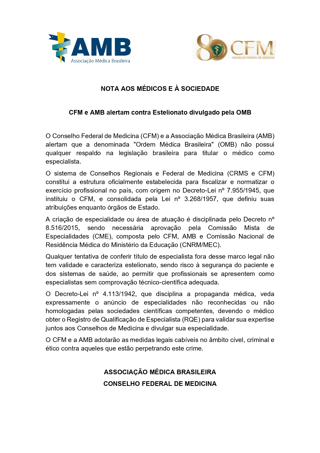 NOTA OFICIAL: CFM e AMB alertam contra estelionato divulgado pela OMB 19 de novembro de 2025 - Categoria: Notícias