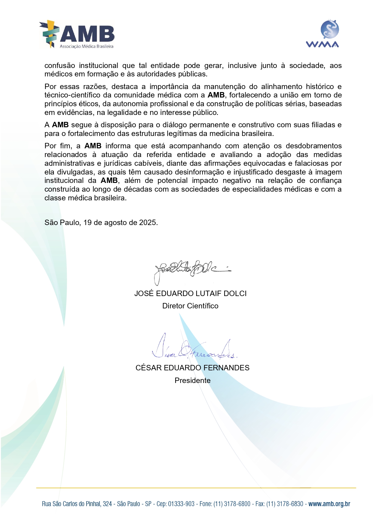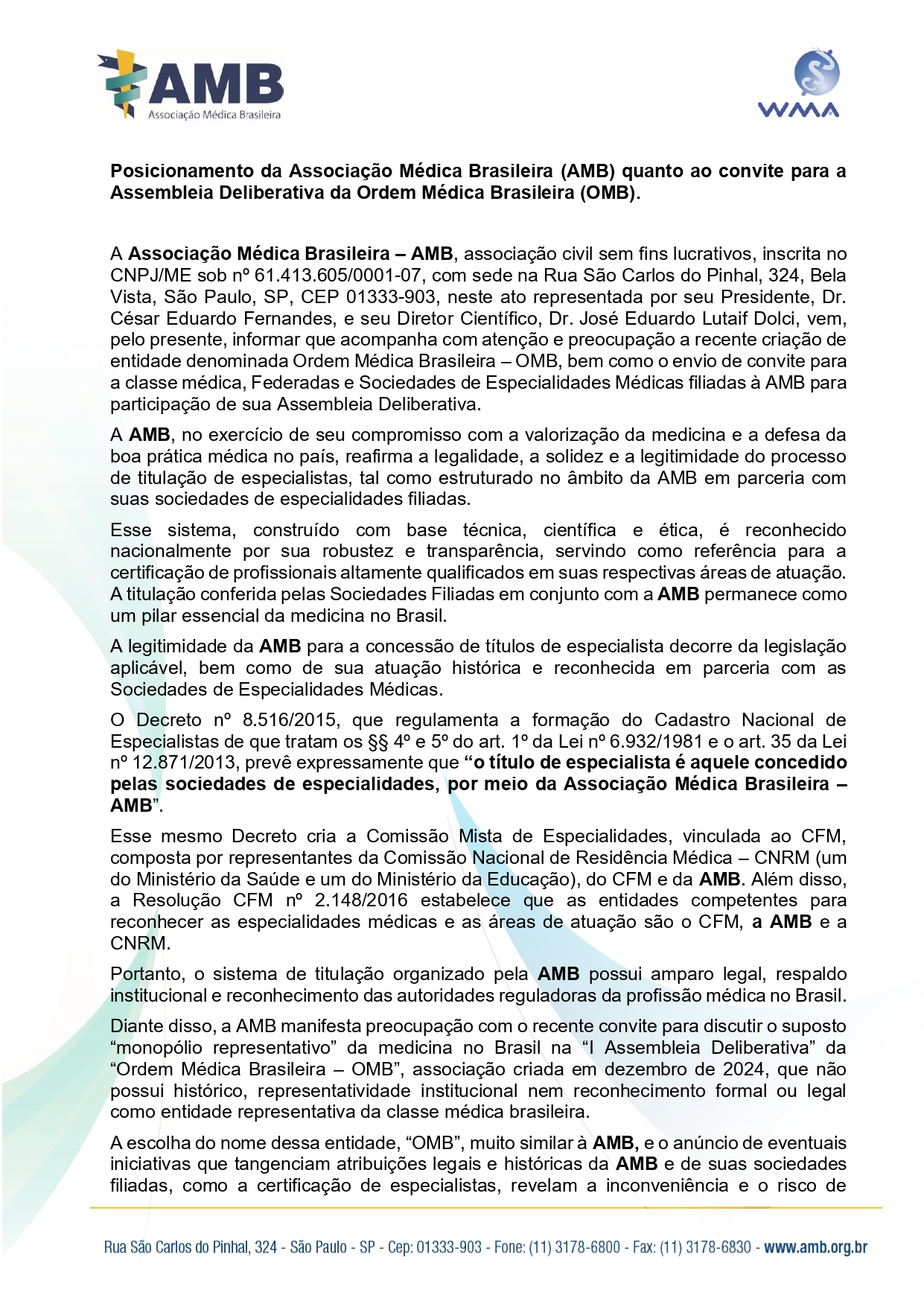 Posicionamento da Associação Médica Brasileira (AMB) quanto ao convite para a Assembleia Deliberativa da Ordem Médica Brasileira (OMB) 22 de setembro de 2025 - Categoria: Notícias
