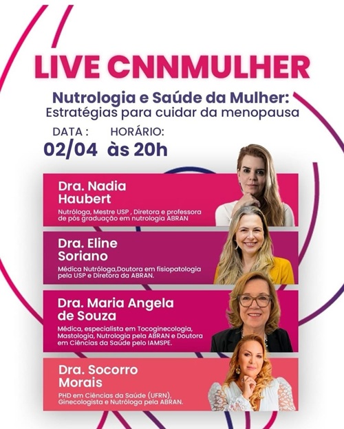 Quatro renomadas especialistas na área apresentaram as melhores estratégias para cuidar da menopausa, fase que traz muitas transformações para a saúde feminina e sua qualidade de vida. O bate-papo contou com a participação da Profa. Dra. Nadia Haubert – médica nutróloga, mestre pela USP, diretora e docente dos cursos de pós-graduação da ABRAN; da Profa. Dra. Eline Soriano – médica nutróloga, doutora em Fisiopatologia pela USP e diretora da ABRAN e da Profa. Dra. Socorro Morais – ginecologista, nutróloga, PhD em Ciências da Saúde (UFRN) e representante da ABRAN no Rio Grande do Norte.